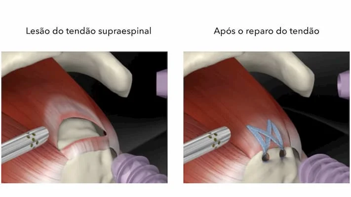 Exemplo de uma lesão do tendão supraespinal (figura da esquerda). Aspecto após a cirurgia por artroscopia para reparação do tendão.