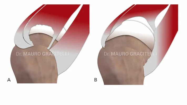 As figuras abaixo exemplificam 2 casos completamente diferentes. Na figura A vemos uma lesão completa de tamanho médio do tendão do supraespinal. Na figura B vemos uma lesão extensa e retraída do tendão do supraespinal, do infraespinal e do subescapular. A expectativa quanto aos resultados é diferente entre esses casos.